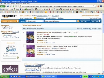 For those interested in the fortepiano playing – there are right now two offers for the Malcolm Bilson’s DVD “Knowing the score” on Amazon.com. The first DVD costs only $6,231.71 (or you can have it used for $7,374.57). The other offer is for $49.95. Your choice…